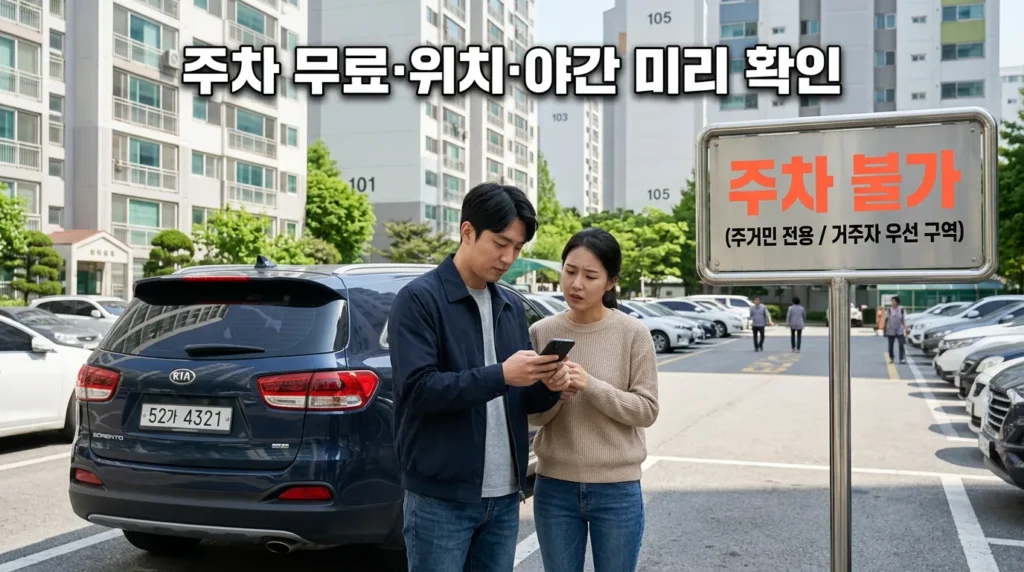 주차 공간이 몇 대인지, 무료인지, 야간 주차가 되는지까지 세트로 물어보면 완벽해요.