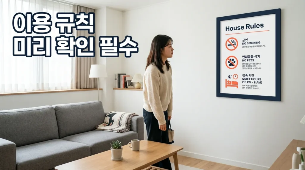 ✅ 숙소 이용 규칙(흡연·반려동물·파티 금지 등)은 사전에 확인해야 분쟁을 막아요.